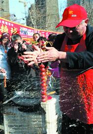 ????一年一度的糖球會讓眾多的市民游客大飽口福。然而,一串串晶瑩可口的糖球是如何由一顆顆山楂制作出來的呢?昨天,記者來到四方糖球會的現場,高家糖球第二代傳人高士湘演示“雪里紅”制作的全套流程。 ????糖球制作過程 ????洗果子圻穿山楂圻熬糖稀圻滾糖球 ????選山楂洗完接著用 ????“要說做糖球其實很簡單,誰都可以做,關鍵是用不用心。 ”高士湘告訴記者,其實制作糖球并不是什么特別難的事情,主要靠多年來積累的經驗和品質,首先是要選擇好的原料。 ????昨天下午2時許,高士湘端來了剛剛洗好的一鐵盤子山楂,基本上每一個都是個頭大、顏色紅、果肉飽滿的好果子。據高士湘介紹,他們選擇的山楂主要來自萊西等青島周邊地區(qū),主要以色澤和果肉質地為挑選條件。 ????為了今年的糖球會,高家一共備了十多噸山楂。至于外界猜想山楂是否不洗就做糖球,高士湘表示他們都是現洗現做,為的就是保證干凈,并非洗過的山楂就不適于做糖球。 ????穿山楂先挑最大的 ????“其實做糖球很簡單,關鍵要靠自己來悟。 ”順手拿起盤子里還滴水的山楂,坐在記者對面的高士湘開始穿山楂。他告訴記者,穿串的時候一定要做到心中有數,穿第一個山楂時就要挑好下面要穿的山楂,第一個最大,剩下的幾個基本上個頭大小一致。不到30秒鐘的時間,高士湘就已經非常麻利地穿完了7個山楂。 “山楂上帶的梗要去掉,用竹簽尖的一頭穿,等山楂穿完后再全部推到另一頭。 ”高士湘告訴記者,當年是父親親手教他們兄弟如何穿山楂,而現在他又把這個小技巧交給了新人,基本每天都要由兩個師傅全天負責穿山楂。 ????煮糖稀關鍵看火候 ????穿好了山楂,高士湘帶著記者來到三個熬糖稀的大鍋面前,滾沸的糖稀正“噗噗”地冒著熱氣。 “每家都用水、糖、芝麻一起熬糖稀,但糖球做得好壞主要要看火候掌握的如何,之前父親都讓我們用眼睛看、鼻子聞和嘴巴嘗,熬糖時盡量用家里那種細糖,比白砂糖一斤貴一毛錢左右。”記者看到,由于熬煮時間不同,三鍋糖稀分別為淺黃、金黃、橙黃色,鍋中的溫度都在100度以上。 ????記者剛湊上前去,就被噴濺出的糖稀燙到了手指,瞬間起了一個白色的泡。舀一瓢清水,拿著一根竹簽,高士湘介紹了高家熬糖稀的訣竅。記者將竹簽蘸上鍋中滾沸的糖稀,再放到水里冷卻成塊,放到嘴里嚼一嚼,覺得一點都不粘牙還嘎嘣脆時,熬糖稀就大功告成了,高士湘便立即高呼一聲,伙計就把做好的一鍋糖稀端走。 ????滾糖球用力轉一圈 ????“給糖球滾糖稀要左右手同時開工,速度要快,不然糖稀就糊了。 ”拿著穿好的山楂,高士湘毫不費力地將山楂半浸入糖稀中,拇指和食指稍用力一捻,山楂身上就裹上了一層透明的糖稀。輪到記者時,看似簡單的動作卻遇到了難題。 “支在鍋邊,用力一轉就好。 ”雖然高士湘在一旁傳授口訣,但記者轉了8串糖球后手就沒勁了,滾出的糖球也總有“一半身子”露在外面,只好再回一遍鍋。記者看到高家很多年輕師傅個個都是滾糖球的高手,高士湘樂呵呵地說:“在糖球會期間,一個師傅站在鍋前滾糖球,有時一滾就是一整天,但看著前來買糖球的市民一波接一波,也就不覺得累了。 ” |