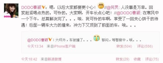 曹穎微博截圖 據(jù)2月15日消息,曹穎更新微博稱自己遭遇了車禍驚魂,自己的愛車被后車大力撞擊,然后頂?shù)角败嚕约簞t悲催的在寒風(fēng)中度過了一個下午,等待警察到來處理。所幸人安然無恙。此言一出,包括何炅等人都在微博上表示了安慰之情。 曹穎原本有一個非常愉快的情人節(jié),她與兒子舉辦了一場燭光晚餐,還特意在微博上秀出了照片。但第二天就遭遇了倒霉事件。2月15日13:34,曹穎突然在微博上稱,自己在六環(huán)外遭遇車禍:“六環(huán)外,車被撞了。郁悶,等警察中,唉。”此言一出,迅速引發(fā)了網(wǎng)友的關(guān)心,大家紛紛留言詢問怎么回事。 但直到5個小時后,曹穎才再度更新微博,她表示自己在開車時被后面的一輛車大力撞到,然后又頂?shù)角懊娴能嚕Y(jié)果花費(fèi)了一個下午才剛剛解決:“在寒風(fēng)中一個下午,總算解決完了。。。唉、我可憐的車啊,享受了一回夾心餅干的待遇!后面一輛車大力的撞來,沖力下又頂?shù)搅饲懊娴能嚕谑侨v車撞成一團(tuán),我的車變成了中間的夾心!唉。”不過,曹穎很慶幸自己的孩子并沒有在車上,“雖然說責(zé)任全在后面那輛車,可是……不是一般的倒霉啊,最慶幸就是寶兒沒坐在車上。唉,回家飯去!” 當(dāng)曹穎在微博上講述了這段驚魂經(jīng)歷后,包括何炅和至上勵合劉洲成都在微博上表示安慰。其中何炅還體貼的說:“人沒事是萬幸。回家趕緊喝點(diǎn)熱的。可憐的。大家啊,開車長點(diǎn)心吧!”對此,曹穎深表贊同:“嗯,以后大家都要更小心!” |