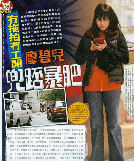 據香港媒體報道,33歲廖碧兒去年因拜金,高調搭上李澤楷表弟林忠豪而狠撇陳豪,最終遭有錢仔玩完即棄,巡用語“豪”門夢碎,拜金形象負面,又淪為無線棄將,迫于無奈北上掙錢,要惜因在內地知名度欠奉,全年只拍了一部劇,近月無拖拍沒工開滯留在港,百無聊賴暴吃令身形發脹走樣。