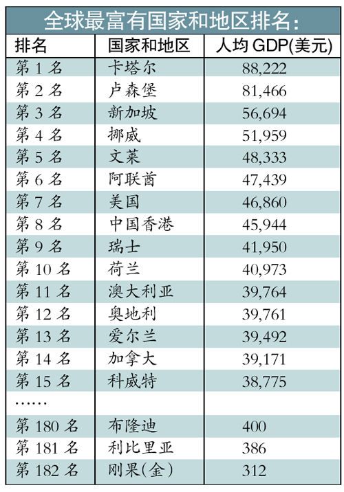 卡塔爾首都多哈景觀 福布斯公布全球多國人均GDP排名 最高近9萬美元 最低僅312美元 近日,《福布斯》雜志對全球182個國家和地區的人均GDP進行了購買力平價調整,得出了全球最富有國家和地區排名。結果顯示,卡塔爾目前在所有國家和地區中最富有,緊隨其后的是盧森堡和新加坡。美國排名第7,而中國香港位列第8。 卡塔爾最富 如果說財富就是力量的話,卡塔爾就是世界各國中勁爆的“肌肉男”。這個海灣酋長國只有170萬人口,但卻在世界各國和地區人均財富排名中位列第一。該國之所如此“健壯”,是因為油價高企讓它賺得盆滿缽滿。此外,它還有豐富的天然氣資源。經購買力平價調整后,卡塔爾的人均GDP早在2010年就超過了8.8萬美元。 位列排名榜第二位的是德法之間的小國盧森堡,該國國土雖小但能量巨大。經購買力平價調整后,人均GDP超過8.1萬美元,略低于卡塔爾。該國只有50萬左右的人口,但從二十世紀下半葉起成為全球最大的金融中心之一。盧森堡嚴格的銀行保密法使其成為歐元區內最重要的私人銀行中心及全球僅次于美國的投資信托中心。 位列排名榜第三位的是城市國家新加坡,作為科技,制造業和金融中心,新加坡的年人均GDP接近了5.67萬美元。 剛果(金)最窮 那么,哪些國家和地區是最窮的呢?排名墊底的是3個政治和經濟都支離破碎的非洲國家,它們是布隆迪、利比里亞和剛果民主共和國【簡稱“剛果(金)”】,其經購買力平價調整后的人均GDP分別為400美元、386美元和312美元。 油氣高價成就富國 不斷攀高的油氣價格和豐富的天然氣儲量使得各資源出口國在財富排名上大大受益。 繼擁有著170萬人口的卡塔爾光榮奪得桂冠之后,前十五名的很多國家和地區也是依靠自然資源而上榜。 排名第四的挪威,其石油的出口占其出口額的將近一半。并且,在該國5.2萬美元的人均GDP(經購買力平價調整)當中,石油出口是主要貢獻來源。此外,挪威還是全球最大的天然氣出口國。 位于加里曼丹島的文萊也是如此,該國憑借儲量豐富的油氣田貢獻的財富而躋身第五,其經購買力平價調整后的人均GDP略高于4.8萬美元。 還有阿拉伯聯合酋長國,該國經購買力平價調整后的人均GDP接近4.75萬美元,而石油和天然氣就貢獻了大約25%的GDP。 其他幾個排名靠前、至少一定程度依靠自然資源的國家包括排名第11的澳大利亞、第14的加拿大、第15的科威特。這其中,原油資源至少為科威特貢獻了一半的GDP,而該國幾乎所有的出口收入和政府收入都來自原油資源。 富國也有很多窮人 《福布斯》公布的這些數據都是目前可以獲得的最新數據,當然,其中一些國家和地區的數據僅僅是推測值。 經購買力平價調整的GDP不僅僅考慮到了匯率,還考慮到這些國家和地區百姓的生活成本和通貨膨脹率。如果僅僅考慮匯率因素的話,可能會造成實際富裕程度的差異出現扭曲。 “從根本上來說,這是我們對不同國家的GDP進行比較的唯一辦法。”美國紐約大學倫納德·斯特恩商學院的經濟學副教授克萊門蒂說,“可以說,這是目前最受認可的數據。”但他同時提醒說,“我們也不能毫無保留地相信這些數據”,因為會有很多因素干擾GDP的比較,這其中就包括各個國家和地區之間的商品質量存在差異。 “還有一個因素就是,有些國家和地區的財富分配是平等的,而另外一些國家和地區的分配卻非常不平等。”克萊門蒂說,“例如,卡塔爾的財富分配就非常不平等,許多卡塔爾人的生活其實非常貧窮。該國的GDP之所以高,是因為有大量的石油收入。如果將GDP數據作為判斷一個國家和地區未來經濟表現有多好的指標的話,那么在卡塔爾,最重要的是實際投資的效果有多好。” |