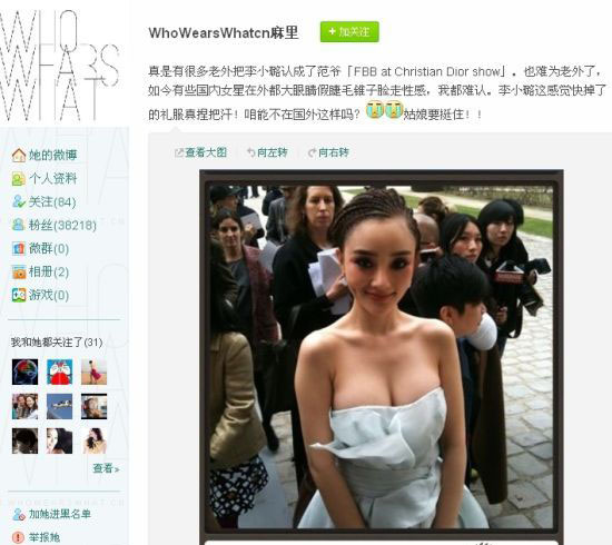 3月3日凌晨零時30分,名為“WhoWearsWhatcn麻里”的新浪微博網友在微博中曬出一張外國時尚雜志的截圖,照片中是李小璐穿著爆乳抹胸小洋裙,一臉微笑的面對鏡頭。而外媒的圖注則寫著:“Fan Bingbing at the Christian Dior show。”