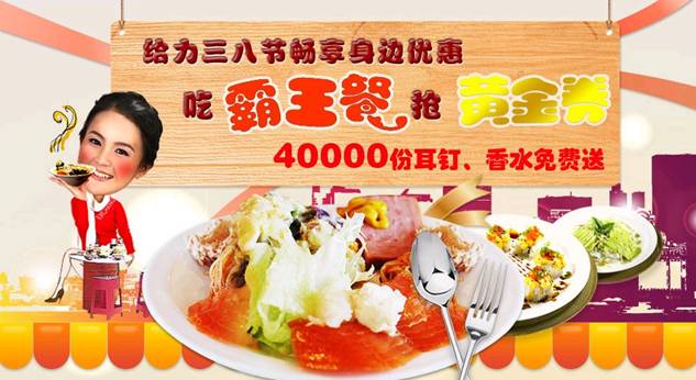 三八婦女節啦,掌上優惠邀您暢享身邊美食優惠。更有機會獲得西單購物中心的黃金代金券還不止這些40000份耳釘、香水免費送哦… … 送給自己、送給愛人、送給親朋好友。趕快行動在這個特殊節日里把禮物送給他、她、送給他們。更有獲得吃霸王餐的機會哦… … 別再猶豫,選取您喜歡的身邊美食優惠吧。