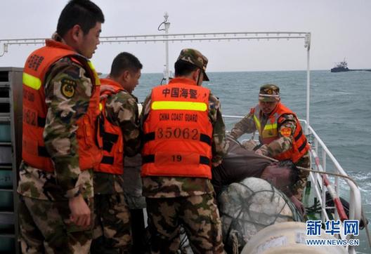 福建海警二支隊(duì)官兵在海上救起漁民時(shí)的現(xiàn)場(chǎng)畫(huà)面(3月7日攝)。