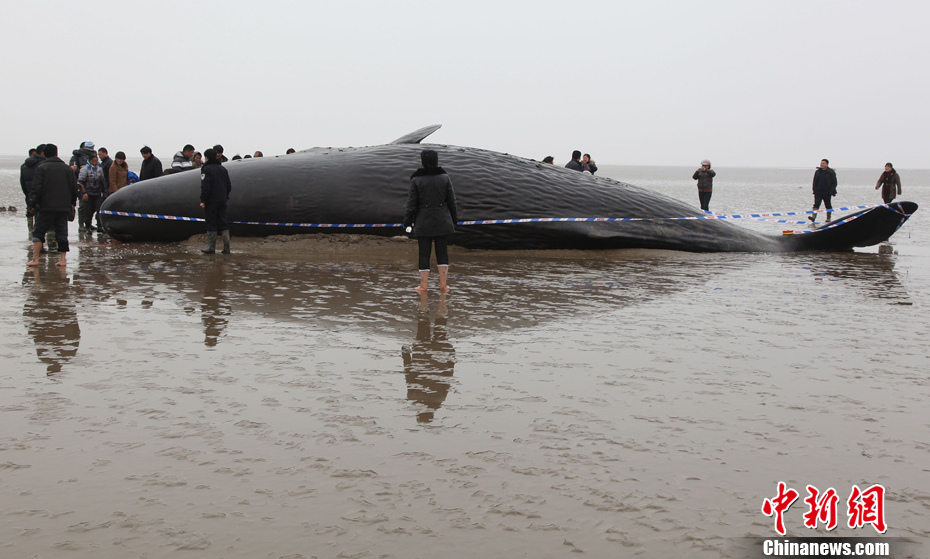 3月17日,在江蘇鹽城市濱海縣境內的黃海海域擱淺的4頭鯨魚,經搶救無效全部死亡,目前死鯨后續處理工作在進行中,這是中國海域第二次大規模鯨魚擱淺群死。據了解,鯨魚是16日上午擱淺的,擱淺的4頭鯨魚大的有三四十噸重,小的也有近二十噸重。目前,地方漁政和邊防部門正在對4頭死亡鯨魚進行看護,等待權威部門作出處理決定。中新社記者于從文 攝