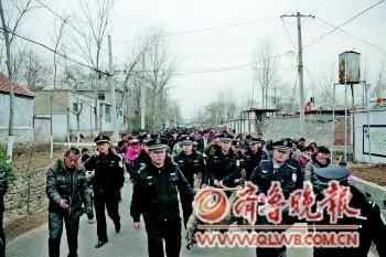 民警抬著被擊斃的咬人狼走在村路上,引來大批村民圍觀。