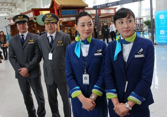 青島至釜山航線機組人員。右邊兩位是韓國空姐