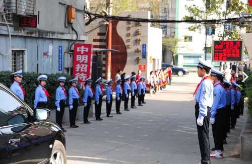 2012年4月1日,武漢建樂村小學的“小小交警隊”同學們清晨身著交警制服在學校門口夾道列隊歡迎某領導視察學校。
