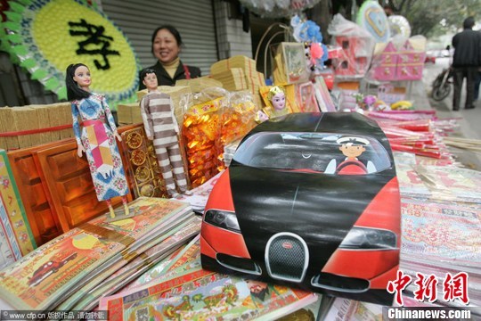 豪車也是熱銷的祭品之一,有的攤鋪還上演了“香車”配“美女”。店鋪老板稱,市民一般都是買一個別墅加一輛跑車。而一些做工較精細的紙扎汽車甚至要好幾千,其中,紙扎高爾夫配件2288元、紙扎jeep越野車3699元一輛、紙扎蘭博基尼跑車更是高達3888元一輛。