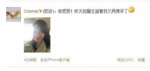 4月6日,香港女星黎姿在微博上宣布自己二度懷孕,她興奮地在微博上說(shuō):“很感恩!昨天經(jīng)醫(yī)生證實(shí)我又再懷孕了。”立刻引來(lái)了幾百名粉絲的恭喜。