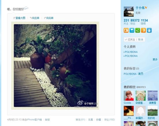 昨天23時13分高圓圓前男友于小偉更新了新浪微博稱:“嗯,你好就好?!边€貼上一張照片,照片中是一株比較大的盆栽孤獨的處于一個角落。于小偉此微博疑似在回應前女友高圓圓與趙又廷的戀情,似乎在祝福高圓圓稱你好就好。(辛佳/文)