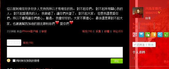 4月10日17時25分Makiyo在微博中寫道:“從以前到現在好多好多人支持我所以才有現在的我。 對不起你們。對不起所有關心我的人。 對不起愛過我的人。 我做錯了。讓你們失望了。 對不起大家。 但是我還是愛你們,所以不會再讓你們擔心,難過。我會好好的,大家不要擔心。 最后還是要對不起大家,也謝謝幫我加油的朋友跟粉絲們,愛你們。”