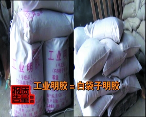 在原料庫房,記者見到了每噸售價三萬多的明膠,還有一種每噸兩萬多的明膠被藏在隱蔽的庫房防范檢查,它們用白色編織袋包裝,上面沒有廠名廠址任何產品標識。兩種價格懸殊的明膠外觀非常相似,都是呈淡黃色顆粒狀,肉眼幾乎看不出有什么差別。
