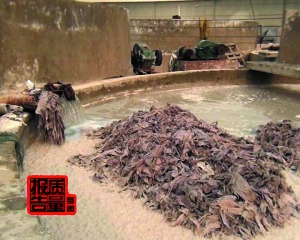 在河北學洋明膠廠,記者目睹了整個加工過程。原本又臟又臭的工業皮革廢料,經過生石灰浸漬膨脹、工業強酸強堿中和脫色、多次清洗等一系列工序處理后,變得又白又嫩,跟新鮮動物皮原料沒什么兩樣。在熬膠車間,清洗后的皮子被放入直徑三四米的熬膠鍋里熬成膠液。熬出來的透明膠液,再經過濃縮、凝膠、干燥、粉碎等工序,就搖身一變,成了淡黃色的“藍皮膠”。