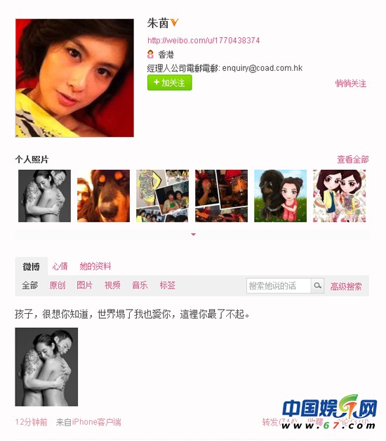 4月17日下午,朱茵微博上傳一張與黃貫中全裸相擁的甜蜜合照,并配以文字“孩子,很想你知道,世界塌了我也愛你,這里你最了不起。”字里行間似乎流露出已有身孕的信息,引來不少網友猜測,也有眾多粉絲在下面留言祝福以及“催婚”。