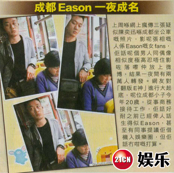 陳奕迅成都翻版陳奕迅網絡爆紅 據香港媒體報道,陳奕迅即將到內地舉行巡回個唱,日前他率先到北京一大學出席代言及迷你音樂會,吸引到大批學生到場支持。據聞,活動門票還被黃牛黨炒到300人民幣一張。陳奕迅在會上除了勁歌熱舞外,還在臺上整蠱作怪,但會后有記者問最近在臺灣媒體評選的十大爛片中,有三部他主演而獲選為爛片王,陳奕迅就乘機伸冤說《東成西就2011》其實票房不算差,都收了幾千萬,只是 上周在網上瘋傳三張疑似陳奕迅在成都坐公交車的照片,拍這三張照片的人是陳奕迅的女粉絲,她說因為這個男人和偶像相似度極高所以忍不住拍了下來放到了微博,結果一夜間有兩萬人轉發。網友對“翻版E神”進行了大起底,這位成都小子今年20歲,從事商務接待工作,他說好久之前已經被人說長得像E神,甚至有同事建議他加入娛樂圈,但他說他沒有這樣的打算。 |