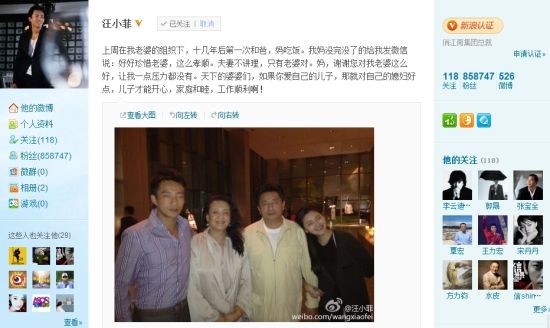 4月25日凌晨,汪小菲發微博,寫到“上周在我老婆的組織下,十幾年后第一次和爸,媽吃飯。我媽沒完沒了的給我發微信說:好好珍惜老婆,這么孝順。夫妻不講理,只有老婆對。媽,謝謝您對我老婆這么好,讓我