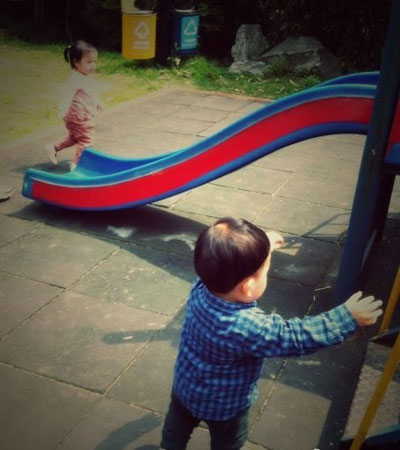 趙薇女兒小四月扎小辮賣萌 與爸爸親密玩耍(組圖)