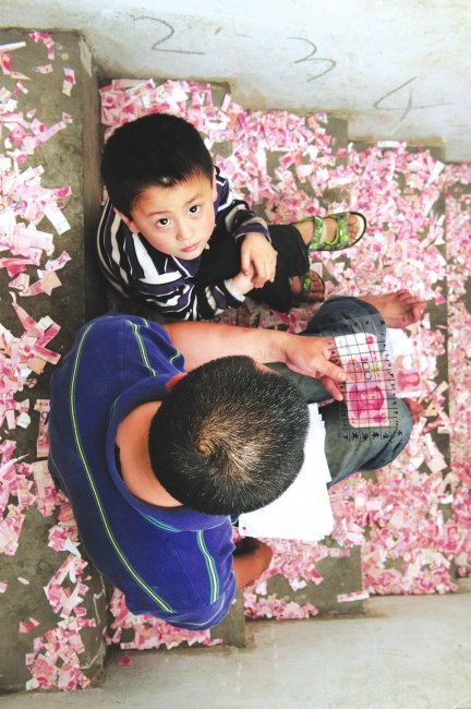 5日早上,在金堂淮口鎮家中,林兆強和姐姐在墻上劃分區域將殘幣歸類,試著拼錢。