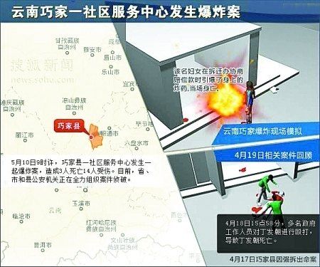爆炸案示意圖 ????據云南媒體報道,云南省昭通市巧家縣白鶴灘鎮花橋社區便民服務大廳發生一起爆炸案件,導致4人死亡、15人受傷。有目擊者透露,之前一女性拆遷戶被通知到縣政府拆遷辦簽協議,該名婦女在拆遷辦協商賠償款時引爆了身上的炸藥,昨晚,當地警方通報稱,案件偵破取得了重大進展,已鎖定了跟案件有重大嫌疑的人員。 ????目擊 ????女拆遷戶引爆身上炸藥 ????案發于10日上午9時許,當時,白鶴灘鎮和社區有關干部正在與當地村民簽征地拆遷協議,現場聚集的人員比較多。爆炸案造成現場3人死亡16人受傷,后來1名傷者在昆明的醫院中搶救無效死亡。 ????有目擊者透露,之前一女性拆遷戶被通知到縣政府拆遷辦簽協議,該名婦女在拆遷辦協商賠償款時引爆了身上的炸藥,導致包括該女子在內的3人當場死亡,十多人受傷,周圍也有數名人士被波及,現場已經被警方封鎖。 ????從網友拍攝的照片上可以看到,爆炸現場位于一樓的一間臨街的房子里面,地上血跡斑斑,很多雜物都散落在血跡之中,爆炸產生的巨大威力,將門口的水泥柱子都炸掉一塊。從照片上還可以看到,房間的地板上躺著幾名受傷的人,全身都是血肉模糊的樣子。 ????進展 ????警方已鎖定嫌疑人員 ????晚上8時45分,記者在昆明云大醫院住院樓見到了其中一位傷者蘭某。據蘭某介紹,自己是白鶴灘鎮迤博村六組的居民。 ????蘭某介紹,自己準備上樓梯進行最后一次簽字時,突然聽見一聲巨響。“我當時就被炸暈了。當時跟我一起簽字的有7個人,其中2個當場就死了。”蘭某心有余悸地說道。蘭某說,與自己一同送到醫院的其他3名傷者中,其中胡姓男子是政府部門的工作人員,而另外兩名姓張的則均為村委會的工作人員。 ????有當地居民反映,在花橋社區拆遷工作中出現了補償款較低、“逼遷”的行為,這引起很多拆遷戶不滿。 ????當地警方介紹,目前案件偵破取得了重大進展:一是死傷人員的身份,除了1人身份有待進一步確認以外,其他受傷人員身份都已確認,機關干部有1人死亡3人受傷,其他傷亡人員均為當地村民;二是根據監控錄像等資料,警方鎖定了跟案件有重大嫌疑的人員。 |