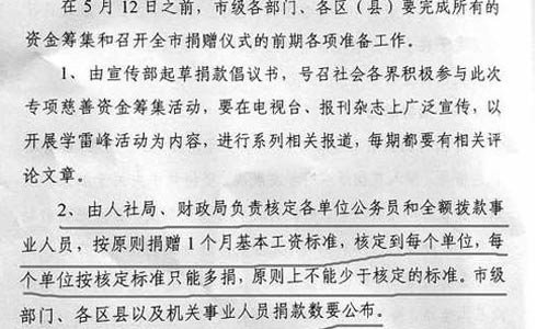 一些企業也在被要求捐款的范圍內。 近日,有不少網友發帖稱,四川省攀枝花市公務員、事業單位在編員工、教師和一些企業等,被強制捐出一個月基本工資給一個新成立的基金。對此,攀枝花市外宣辦負責人稱,這個“扶貧幫困基金”為常設基金,目標是籌集五千萬元,但捐款都屬于自愿。募捐發起方攀枝花市慈善會也否認強捐,稱募捐的并非專門基金而是一個專項資金,且為“自愿捐助”,目前僅市級單位就已籌得900多萬元資金。 不過,數名攀枝花網友對南都記者證實,他們近期的確被要求捐出一個月的工資,攀枝花團市委一名副書記也證實,捐款數額“原則上不低于一個月的基本工資”。 捐款通知文件網上流傳 “四川省攀枝花市強迫公務員和教師捐一個月基本工資,這種強制捐款行為違法嗎?”5月10日,有網友在百度知道發帖咨詢。同樣內容的帖子也出現在百度攀枝花吧。有網友回帖說,“我目前每月還房貸1700元,家里面水電氣網費每月300元左右,攀枝花的物價大家都知道高得離譜,一個人生活費按500元算。我一個月工資2700元多一點,本次被捐款近800元。這個月要養活自己有點難。” 還有帖子稱,攀枝花市東區的所有教師都要求按職稱等級進行“自愿”捐款,高級職稱1700元,中級職稱1300元,其他人員900元。網友表示,學校的捐款數額都是有規定的,教師的捐款也要與年終考核掛鉤。還有網友稱,此次捐款是直接從工資卡中扣除的。 同時,網上還流傳著一份據稱是這次捐款的通知文件。這份文件稱,“由人社局、財政局負責核定各單位公務員和全額撥款事業人員,按原則捐贈1個月基本工資標準,核定到每個單位,每個單位按核定標準只能多捐,原則上不能少于核定的標準”:“由市直機關工委牽頭,各單位黨委負責,積極組織市級部門捐款,按人社局和財政局核定的標準,完成捐款任務”。 根據攀枝花市政府網站的一則消息,攀枝花市委辦公室、市政法委、市紀委、監察局、市委宣傳部、市第三高級中學等單位,分別在5月8日、10日“踴躍捐款扶貧濟困”,共募捐了741145元,其中攀枝花市第三高級中學教職工共募集43.7萬元。 眾網友證實“被強捐” 多名攀枝花網友向南都記者證實,其本人或親屬被單位要求捐一個月的基本工資,受訪網友表示,捐款范圍包括公務員、事業單位在編員工、教師和一些企業,但受訪網友均要求匿名。 一名網友對南都記者稱,其家人被“強制性”要求捐了一個月的基本工資,還不準在網上議論。“領導說,捐了就捐了,不要出去瞎說”。這名網友說,雖然原則上是自愿捐款,但是“領導說,原則上是自愿,你要是真的有困難,行啊,那這個錢我給你交什么之類的,敢不交嗎?說是原則,誰知道領導給不給小鞋穿。”該網友稱,其家人捐的金額超過了1000元。 一名網友則表示,自己被強捐了500元,不僅公務員要捐,企業也有指標。她說,不便透露自己單位的情況,“上面說了要是透露開除公職,真有被強奸了還不能喊的感覺。”另一網友稱,其親友是教師,被強捐了一個月基本工資1200元,“他們是不敢在網絡上傳播信息的,會被公安局的人查IP”。 一名身在北京的攀枝花網友致電家人后告訴南都記者,其親屬夫婦兩人都是中學的高級教師,“被學校規定”各捐了1700元,雖然有怨言,但最后還是交了。據稱該學校規定了“900、1300、1700”三個捐款等級,后勤捐了900元。這對教師夫婦拒絕了記者的直接采訪。 記者還聯系到攀枝花團市委一位副書記。其在接受記者的采訪時表示,自己收到的通知是,要求捐款數額“原則上不低于一個月的基本工資”。他表示,自己捐款的金額超過了一個月的基本工資。 采訪中,多名攀枝花網友對記者稱,當地一個名為“gogo攀枝花”的論壇因為討論“強制募捐”而被關閉。記者訪問該論壇,發現顯示“進行數據整理升級,暫停訪問”。 站方告訴南都記者,因為接到有關方面的通知,稱論壇有“不良信息,要求配合”,因此站方主動關閉了論壇。在被問及是否與討論捐款一事有關時,站方人員稱“可能有關。” 否認設目標,稱系自愿 對網友的爆料,記者分別向攀枝花市外宣辦和募捐發起方攀枝花市慈善會作了求證。 攀枝花外宣辦回應,此次捐款是為攀枝花市慈善會發起的扶貧幫困基金籌款。外宣辦副主任姚榮祥介紹說,此項基金為常年基金,目標是籌集五千萬元。姚榮祥表示,捐款是自愿的,并否認網友捐款與年終績效考核掛鉤的說法。南都記者向其求證網上流傳的通知文件,姚榮祥稱“具體情況不清楚”。 攀枝花市慈善會方面則否認存在目標籌款數額。慈善會在書面回復中稱,網上流傳的通知文件“經我會確認系偽造”。對“強捐”、“被捐”等帖子,慈善會稱,這是“個別單位存在宣傳動員不夠、工作不深不細、工作方法簡單”造成的,并表示已向市委市政府及有關部門做了匯報,重申自愿捐助的原則。 攀枝花市民政局長、慈善會常務會長錢衛在接受記者采訪時稱,此次發起捐款是為了籌集幫扶特殊困難群眾的資金,這只是一個專項資金,而非外宣辦所稱的“基金”,該資金也未設定募捐目標數額。 錢衛稱,該慈善資金將建立長效機制,但對下一年是否還會進行大范圍全市捐款,錢衛表示暫未確定。錢衛稱,就他本人而言,月工資六千多元,這次捐出了兩千多元。整個慈善會不包括臨時工共六人,總共捐出七千多。據錢衛介紹,截至目前,不包括縣