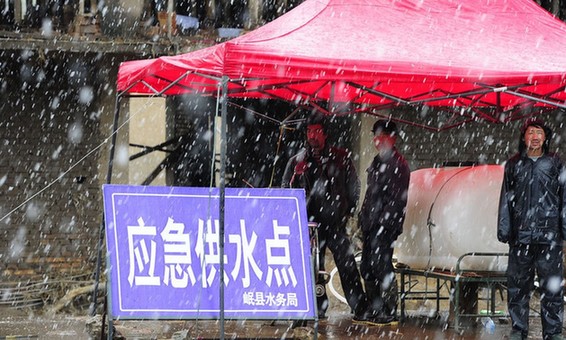 2012年5月13日,甘肅岷縣,雹洪災(zāi)搶險(xiǎn)第3天,安置點(diǎn)下起大雪。(巖石 攝)