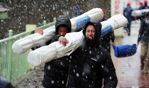 2012年5月13日,甘肅岷縣,雹洪災(zāi)搶險(xiǎn)第3天,安置點(diǎn)下起大雪。(巖石 攝)