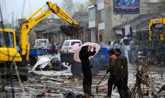 2012年5月13日,甘肅岷縣,搶險(xiǎn)救援工作仍在繼續(xù),安置點(diǎn)下起大雪。(巖石 攝)