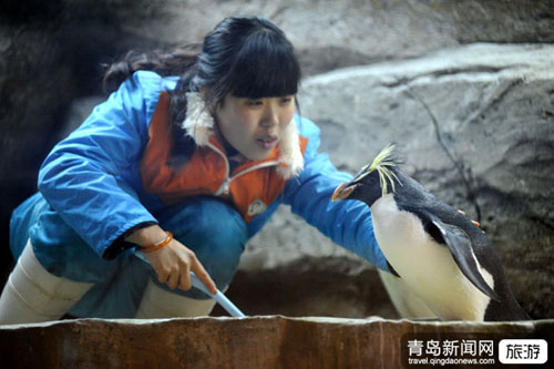 ????“我一進飼養區,蛋蛋就要和我親近不是讓我抱著它,就是讓我摸摸它?!蓖鯄魤粜χ嬖V記者,每次為企鵝飼養區打掃衛生時都帶著圍裙,后面都系著扣,蛋蛋特別聰明,每次都要啄開飼養員的圍裙?!斑@還不算,蛋蛋每次見著我都要圍著我轉,并且要我抱著它,而且還伸長脖子蹭我的褲腿?!睋私?,這都是企鵝向對方求愛時才會發出的信號。