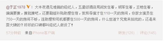 條微博上寫道“大半夜遇見難搞的經紀人,五星級酒店周潤發住著,胡軍住著,王艷住著,偏偏要搬,搬就搬吧,還要劇組補貼助理住宿,我和導演才住110一天的房間,你家女演員住750一天的房間不夠,連助理和司機都要住500一天的房間,什么世道?究竟來拍戲的,還是來耍大牌的?好好的口碑都叫經紀人做沒了!”隨后,于正似乎余怒未消,又連發了兩條微博,稱“自出道以來,合作過的女星無數,范冰冰董潔林心如楊冪陳喬恩霍思燕都隨劇組住宿,從無特殊化,更別說住著五星級還抱怨不能養狗,連助理的待遇也要超過導演,實在欺人太甚,我知道這一寫,明日必定爭議,無論罵聲也好,換演員也好,我都受了,希望適可而止!”