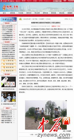 接到爆料,中原網(wǎng)記者打開了網(wǎng)址為 的頁面。這是一篇題為《南湖沙灘公園綠化景觀優(yōu)化工程完成移交》的新聞,發(fā)布時間為2012年5月9日,位于杭州市余杭區(qū)政府網(wǎng)站“部門頁面 >>農(nóng)林集團(tuán) >>工作動態(tài)”欄目下。