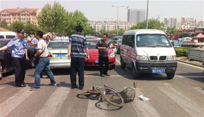 ????“我把車停在路口等紅燈,眼看著這輛綠色的出租車從遼陽西路右轉沖過來,迎頭撞在我們兩輛車之間,我們連躲避的機會都沒有。”記者聞訊趕到遼陽西路與勁松四路路口看到,一輛綠色的出租車車頭向北停在逆行車道上,車頭跟一輛黑色的別克車和一輛紅色的起亞車撞在一起。一輛自行車倒在出租車后面的人行道上,騎車的男子已經被救護車送往浮新醫院急救。交警已經趕到正在勘查現場。據現場目擊者稱,事發時,這輛出租車是為了躲避從勁松四路沖出的摩托車,才會接連撞上自行車和兩輛轎車。