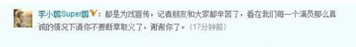 然而沒想到在微博上隨便的一句牢騷,卻被李小璐看見并開始和該記者理論起來,“鬧騰?我愿意談?在人性和道德上我相信我問心無愧。我不需要可憐兮兮的為您所謂的通稿而低頭,三歲拍戲到現在為的是我有信仰的家庭和觀眾以及善良懂事理的記者。but,I still feel grateful.Thanks a lot.”