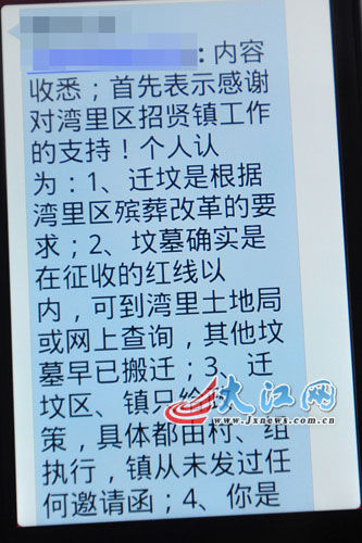 “我們兄妹憤怒的是,整件事情,我們沒有收到一份與遷墳有關的正式文件或者公函,招賢鎮沒有一份蓋公章的文件給我們。”王迪薇說,他們唯一看到的是灣里區農村殯葬改革辦“致廣大村民朋友們的一封信”。王迪薇表示,殯葬改革也好,社會新農村建設也好,整頓市容也好,只要證明是政府行為,他們都支持。王迪薇兄妹想不明白的是“你既然是政府行為,你為什么不發一個公函來?”“我們家后輩眾多,我們要給大家傳真公文,告訴大家‘小家服從大家’。”王迪薇說,遷祖墳的事全家人都非常重視,10個兄弟姐妹都說開舊墳的時候全部都要到場,“現在這個情況,我都沒法跟他們交代。”