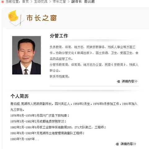 ????蕪湖市政府網站資料顯示,詹云超是四川夾江人,53歲,1991年加入九三學社,2003年1月起任蕪湖市副市長,分管教育、體育、地方志等方面工作。