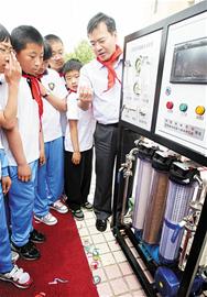 一臺機器完全是透明玻璃制成的,一個玻璃方框里放著一支像船槳似的東西;另一臺機器上則像一臺巨型電表,不同的是,上面有紅紅綠綠的好多按鈕,還有好幾個復雜的儀表盤。“聽說海水進去了轉一圈出來就能直接喝!”孩子們上前把兩部機器圍了個水泄不通,還纏著老師們問東問西。看到學校科技老師有些問題答不出來,國家海洋局科技司副司長雷波連忙上前充當起了臨時講解員。在雷波深入淺出的介紹下,孩子們五花八門的問題一一得到了權威答案,這才感到心滿意足。