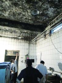 食堂負(fù)一層是面點(diǎn)加工房間,大約有近200平方米,也是存放蔬菜的地點(diǎn),這里污水橫流,還有幾處積水位置,積水最深處竟有4公分。加工間內(nèi),面粉堆積在地上,與污水結(jié)合變成了“面糊”,面板周圍也都長(zhǎng)滿霉斑,還有蟲(chóng)子來(lái)回爬。更讓人意外的是,整個(gè)地下加工間的天花板布滿了黑色的霉斑,多處墻皮脫落,有的墻皮脫落后直接掉在面板上。與加工間僅一墻之隔的是一個(gè)下水管道,沒(méi)有封口,整個(gè)房間里充滿刺鼻的惡臭。