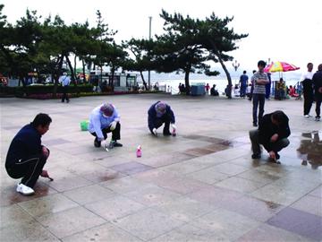 為了給棧橋除“雀斑”,從5月末開(kāi)始,動(dòng)用一輛高壓水車,30名年齡均在45歲左右的棧橋管理和保潔人員開(kāi)始了一場(chǎng)清除口香糖的“攻堅(jiān)戰(zhàn)”。管理員王立新告訴記者,當(dāng)時(shí)一共購(gòu)買了80桶重1斤的洗衣液,200多個(gè)刷鍋用的小鐵刷和10公斤火堿,還給每個(gè)人配上了皮手套,每天早上7點(diǎn)就開(kāi)始動(dòng)工,一直要忙到下午5點(diǎn)。 “先要拿著水槍使勁沖,但很多附著在地上的口香糖都需要一點(diǎn)點(diǎn)拿鏟子鏟,實(shí)在不行就得用上火堿。 ”王立新笑著說(shuō),趁著廣場(chǎng)上還沒(méi)安上攔車柱,水車也沿著西東廣場(chǎng)一直開(kāi)到了回瀾閣上。“現(xiàn)在走在路上還是能看到清理后留下的黑斑,但是沒(méi)以前明顯了。 ”王立新告訴記者,每逢周末便會(huì)超過(guò)10萬(wàn)人,進(jìn)入7月旅游高峰期后,預(yù)計(jì)游客量將會(huì)激增至13萬(wàn)人,景區(qū)內(nèi)并沒(méi)設(shè)立提示牌,還需要游客能自覺(jué)文明游覽。