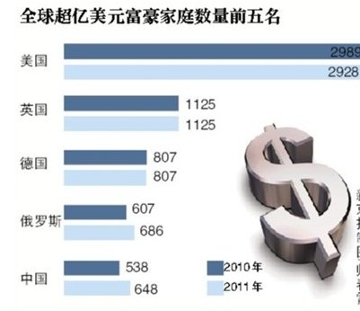 同時,中國財產超過一億美元的超級富豪家庭比去年多了110戶,增長20%。美國財經雜志《福布斯》評論稱,“這一點很值得注意,2009年中國在超級富豪人數榜上還是第13位,沒有一個國家實現過這樣的跳躍。”