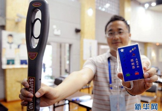 ????6月6日,在華東模范中學考點內,工作人員在展示金屬探測棒和無線耳機探測器。
