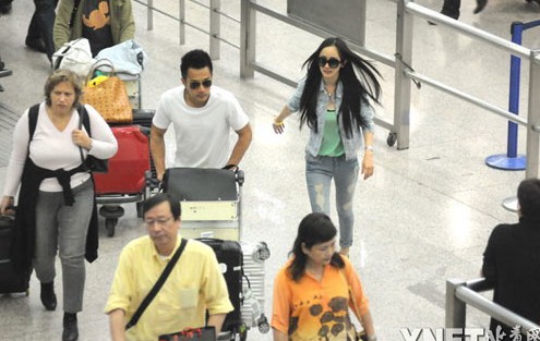 楊冪劉愷威情侶裝現身機場 楊冪摘墨鏡安檢素顏憔悴(圖)