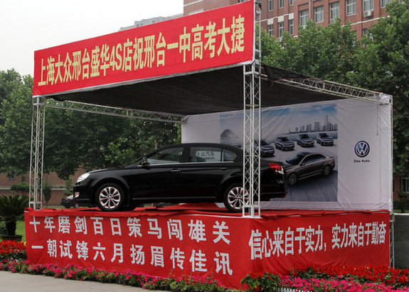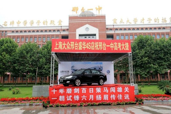 6月5日,高考在即,河北省重點中學邢臺一中在校園內高調展出一輛轎車。該校校長高云洪對記者表示,轎車將獎勵給該校高三教師,“如何獎勵要等高考成績出來再說”。