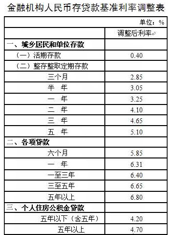 > 正文????中國人民銀行決定,自2012年6月8日起下調(diào)金融機(jī)構(gòu)人民幣存貸款基準(zhǔn)利率。金融機(jī)構(gòu)一年期存款基準(zhǔn)利率下調(diào)0.25個百分點,一年期貸款基準(zhǔn)利率下調(diào)0.25個百分點;其他各檔次存貸款基準(zhǔn)利率及個人住房公積金存貸款利率相應(yīng)調(diào)整。