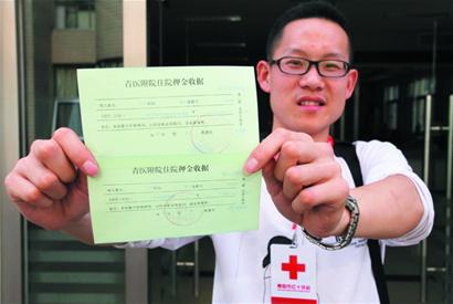 青醫附院新生兒科一醫護人員將620元的住院押金條交給了趙祥海。“昨天,有位大姨來這邊找你,等了半天也沒等到你,我說你可能在黃島不一定哪天過來。”該醫護人員說,隨后她和大姨一起將620元打進了老二恩志的住院賬戶里。