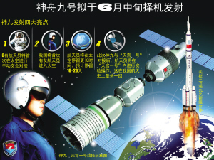 6月中旬,神舟九號飛船將搭載3名航天員擇機發射升空,與“天宮一號”目標飛行器交會對接。我國首位女宇航員也將搭載飛船進入太空,這也是我國首次載人空間交會對接。