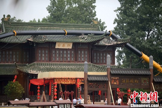 6月11日,某商業劇組在揚州瘦西湖拍電視劇,期間用于拍攝所用的重達58噸吊車發生側翻,48米長的吊臂砸在瘦西湖熙春臺的屋頂上,致熙春臺三個飛檐損壞嚴重,屋頂瓦片多處受損。中新社發盧輝 攝