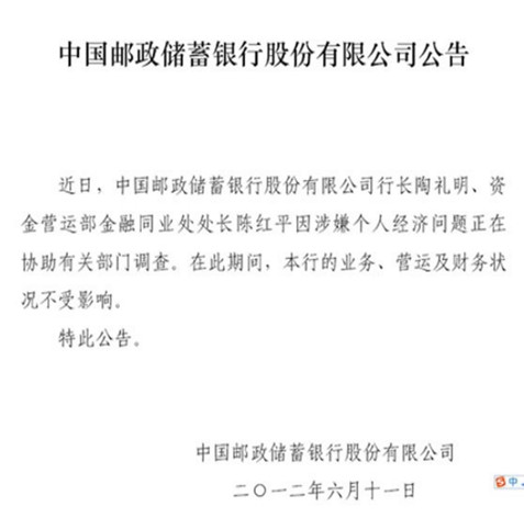 銀監會人士周一向記者證實,郵儲銀行行長陶禮明已被中紀委“雙規”,同時還有郵儲銀行多位中層被帶走協助調查。此消息已于上周四在郵儲銀行的母公司中郵集團通報,同時通報被中紀委雙規的還有中郵集團子公司中郵信通實業投資有限公司董事長兼總經理張志春及另一位高管。