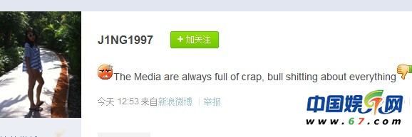 不過,今天(6月11日)下午12點53分,竇靖童在名為“JING1997”的微博中怒斥傳媒報道,稱有關她與母親王菲的報道和傳聞全是胡說八道,“The Media are always full of crap, bull shitting about everything”(媒體總是胡扯,所有報道都是胡說八道。)
