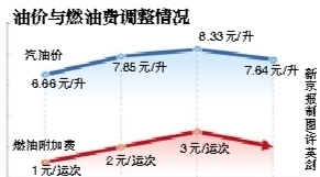 2009年11月,北京完善了出租車租價油價聯動機制。當油價在6.50元/升-7.10元/升時,對乘距超過基價公里乘客加收1元/運次燃油附加費。一旦油價低于7.1元/升時,燃油附加費標準相應下調。按照聯動機制,當油價跌回6.50元/升-7.10元/升的區間時,燃油附加費降回1元/運次;當油價跌至6.50元/升以下,取消燃油附加費。