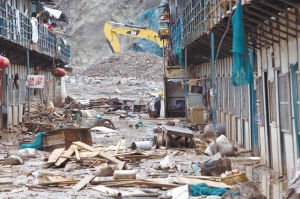 工棚區位于一條山溝的下方,一側是兩排活動板房搭建的工棚,板房有兩排,高兩層,有近百間房屋。這些活動板房形成的巷道里,還有絕大多數一樓的房間里,有30厘米后厚的泥漿,泥漿里混雜著一些衣物、椅子……