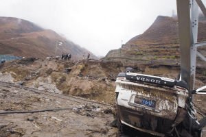 工地有關負責人說,洪水把山上的石頭沖下來堵塞住水溝,洪水從公路上沖下來,沖了工人的帳篷。洪水來時,有一名工人倉皇逃到水溝對面的工地里,成功逃生。還有3名工人死死抱著路邊一根交通指示牌的鋼管,那根大約4米高的鋼管,救了這3名工人的性命。在鐵塔旁,還有一輛被洪水掀翻的白色本田轎車。工人說,這輛車是工頭的車,當時工頭開著車,洪水在后面追,工頭只好棄車逃跑,僥幸逃生。